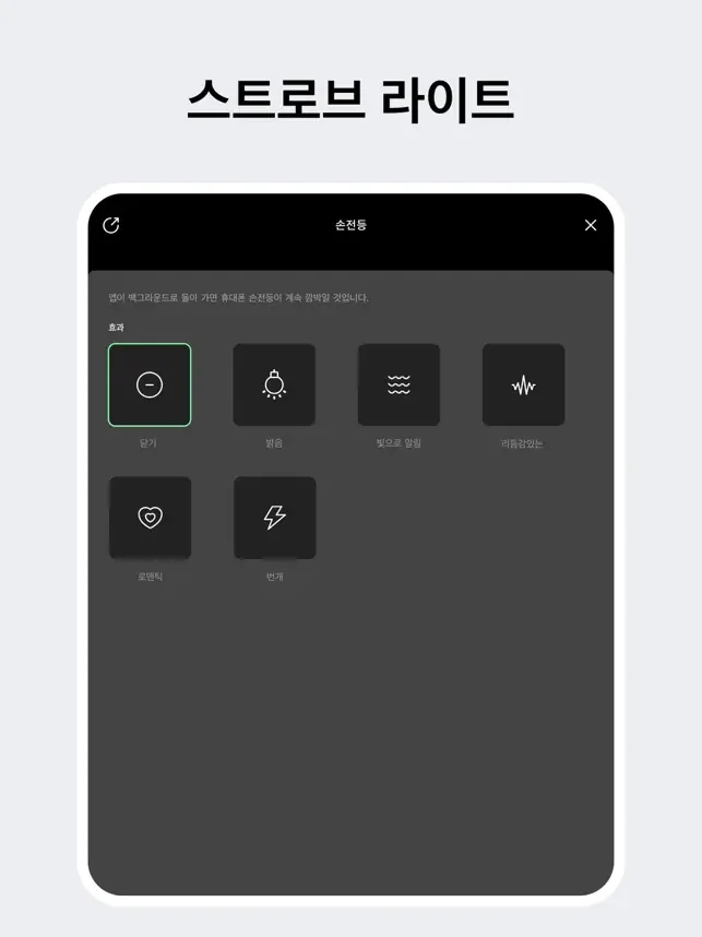 화면을 사용하여 다채로운 플래시를 만들 수 있습니다. 깜박이는 색상과 색상 재생 순서를 개인화하여 휴대폰을 디스코 조명 및 파티 깜박이는 조명으로 바꿀 수 있습니다(배경 이미지를 변경할 수 있음).