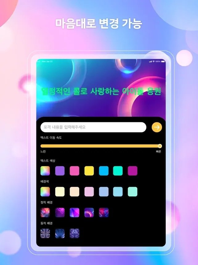 LED 전광판 iPhone 아이 iPad 완벽한 디스플레이 텍스트 스크롤러입니다. 전화 화면을 쉽게 사용하여 표현하려는 메시지를 표시 할 수 있습니다. LED 디스플레이 앱은 사랑 표현, 파티 채팅, 게임 응원, 팬 미팅 또는 콘서트와 같은 요구 사항을 충족할 수 있습니다.