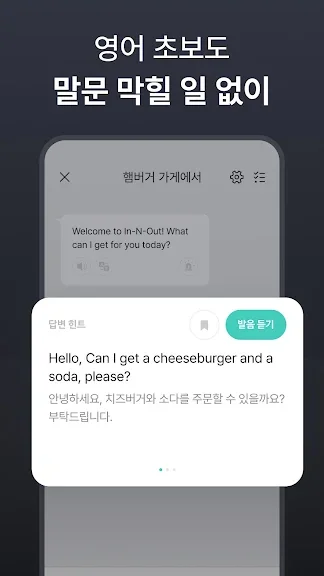 • AI가 사용한 표현이 어렵다면 번역 버튼을 눌러 뜻을 볼 수 있고 다시 들어볼 수도 있어요.