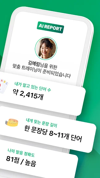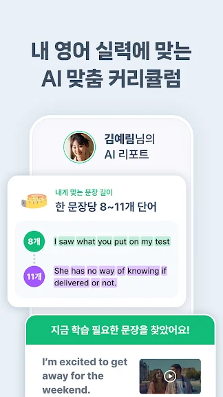AI가 내가 실제로 말할 수 있는 영어 문장의 길이를 정확하게 분석하고, 이를 기반으로 적합한 문장을 추천합니다. 영어 실력을 가장 효율적으로 빠르게 늘릴 수 있어요.