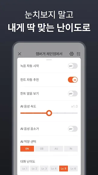 어떤 레벨의 사용자라도 포기하지 않도록, 영어회화 난이도와 속도를 조절할 수 있고 답변 힌트로 대화를 자연스럽게 이끌어주어 영어 초보도 말문 막힐 일 없이 스피킹이 가능해요.