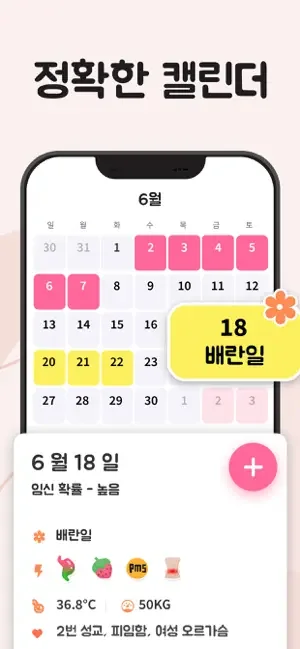 사용하기 쉬우면서도 많은 기능을 가지고 있습니다. 불규칙한 생리 주기, 몸무게, 체온, 기분, 혈류, 증상 등을 관리하실 수 있으며, 가임기, 배란기, 생리 기간을 예측하는 데에 있어서 훌륭합니다. 이 앱에 자신의 생리 주기를 기록하여 알고 싶은 주기일을 정확하게 예측해보세요.