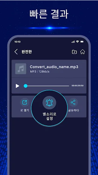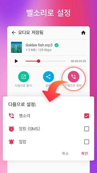 * 저장 및 설정 : 변환된 MP3를 내부 저장소에 저장하고 벨소리, 알람, 알림음으로 설정합니다.