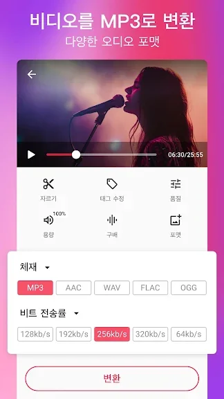 동영상을 MP3로 변환 으로 동영상 파일 자르기 및 다듬기를 할 수 있고 많은 옵션과 함께 동영상을 MP3 및 AAC로 변환 할 수 있습니다. 동영상에서 고품질 MP3 음악을 빠르게 추출 할 수 있습니다.