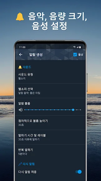 - 스누즈, 타임아웃, 진동, 기본소리, 볼륨조절