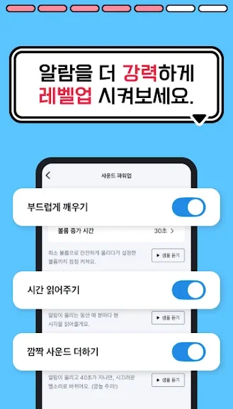 - 갑자기 큰 알람소리에 놀라지 않도록 알람소리 볼륨이 천천히 커지면서 서서히 잠에서 깰 수 있도록 도와드립니다.