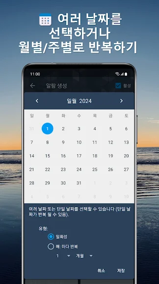 • 반복 알림 간격 설정: 연간, 월간, 주간, 일별, 시간별 및 하루 알림 횟수 지정