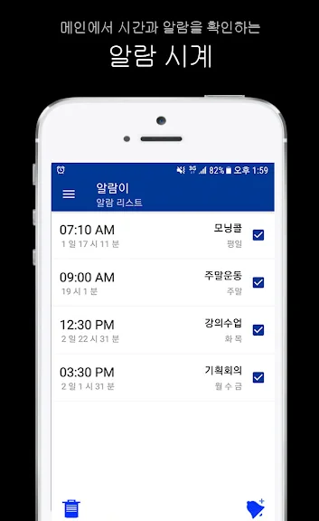 ★ 알람은 1회, 매주 반복 또는 미래의 특정 날짜에 지정할 수 있습니다(2025년 1월 1일도요? 물론이죠, 왜 안되겠어요!)