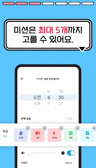 부드럽거나 시끄러운 소리, 좋아하는 음악 등 원하는 벨소리를 설정하거나, 몸과 뇌를 확실히 깨워 줄 여러가지 미션을 원하는대로 조합해 볼 수도 있어요!