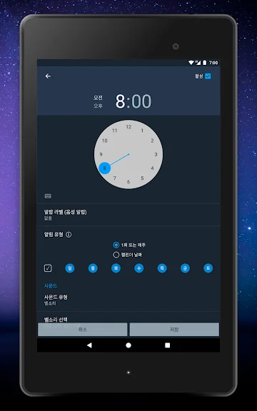 매일 같은 시간, 근무일, 주말 또는 주간에 같은 시간에 일어나려는 경우, 알람을 생성할 날짜를 쉽게 선택할 수 있으며, 알람 시계는 매주 해당 요일에 꺼집니다.