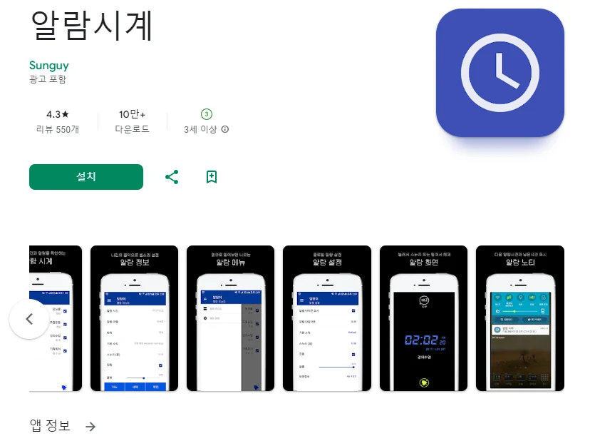 알람시계 어플에 대한 스크린샷 정보가 필요하시다면 아래 이미지를 참고하시기 바랍니다.