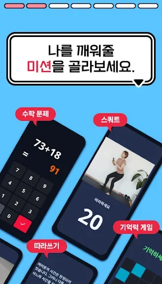 ■ 멀티플 미션 - 하나의 미션으로 부족하시다면, 원하는 미션을 2~5개까지 설정하여 더 확실하게 일어나보세요! (예 : 수학문제 - 따라쓰기 - 흔들기 - 스쿼트 - 수학문제)