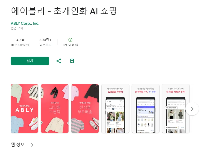 에이블리 - 초개인화 AI 쇼핑 어플에 대한 스크린샷 정보가 필요하시다면 아래 이미지를 참고하시기 바랍니다.