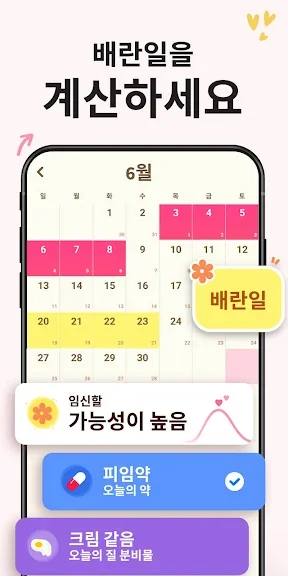 - 비가임기, 가임기, 배란기, 예정일, 생리 기간을 알려주는 직관적인 달력