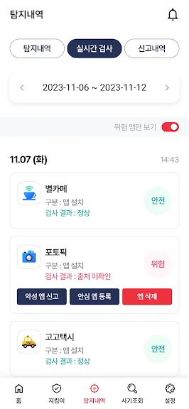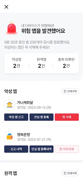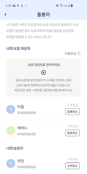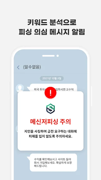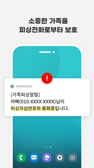 특히, 악성 앱을 감지하여 보이스피싱에 악용될 가능성이 있는 앱을 차단하고, 피싱 의심 번호와의 통화 시 단계별 경고를 통해 위험을 사전에 차단합니다. 또한, 가족과 지인을 사칭한 메신저 피싱을 감지해 경고 알림을 보내주며, 피싱이 의심되는 상황이 발생할 경우 가족에게도 즉시 알림이 전달되어 더욱 철저한 보호가 가능합니다.