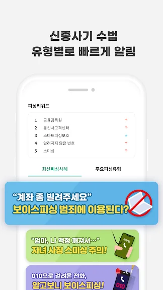 스마트피싱보호는 국내외 빅데이터 분석을 통해 최신 피싱 유형을 사용자에게 제공하며, 반복적으로 발생하는 주요 피싱 유형을 알려 예방을 강화합니다. 이로써 사용자는 사기 수법에 대한 이해도를 높이고 더욱 안전한 금융 생활을 누릴 수 있습니다.