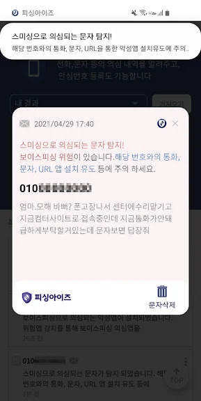 피싱아이즈는 보이스피싱 사기 프로세스를 체계적으로 차단하며, 특히 악성 앱이나 원격제어 앱이 탐지되면 사용자에게 즉각 알림을 제공합니다. 또한, 악성 URL이 포함된 스미싱 메시지를 탐지하고, 가족이나 지인의 번호를 보호 대상으로 등록할 경우, 해당 기기에서 발생하는 보이스피싱 의심 상황을 실시간으로 알려주는 유료 서비스도 지원합니다.