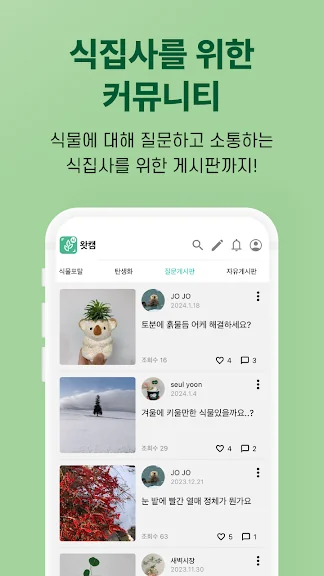 이 어플은 식물 초보자부터 전문가까지 모두에게 유용합니다. 식물을 키우며 발생하는 질문에 답을 찾고 싶거나, 자신의 정원을 자랑하고 싶다면 왓캠 커뮤니티를 활용해보세요. 질문게시판과 자유게시판에서 다양한 이야기를 나누고, 해시태그를 통해 원하는 정보를 손쉽게 검색할 수 있습니다.