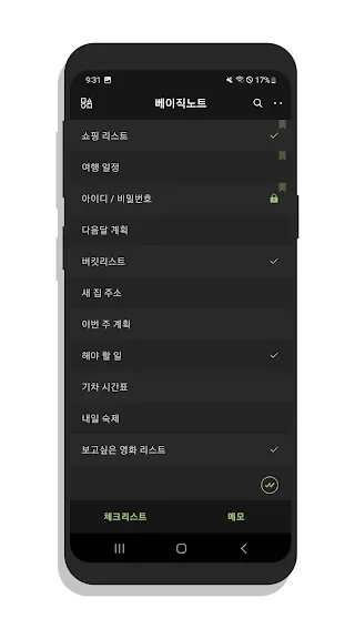 - 간편하고 빠른 노트 작성, 체크리스트 모드와 텍스트 모드 지원