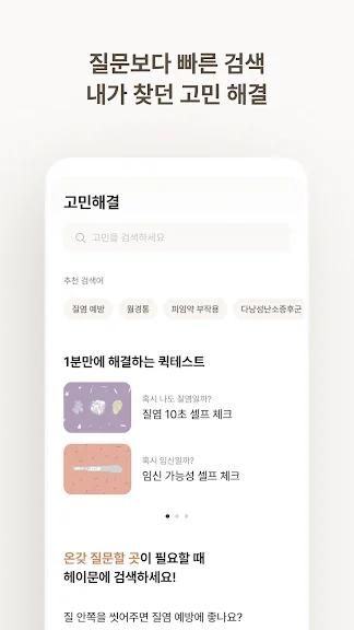 헤이문은 여성 건강에 대한 고민을 키워드로 빠르게 해결해줍니다. 질염, 피임약, 월경통 등 다양한 건강 문제에 대한 콘텐츠와 적합한 제품을 제시하여 문제를 해결할 수 있도록 지원합니다.