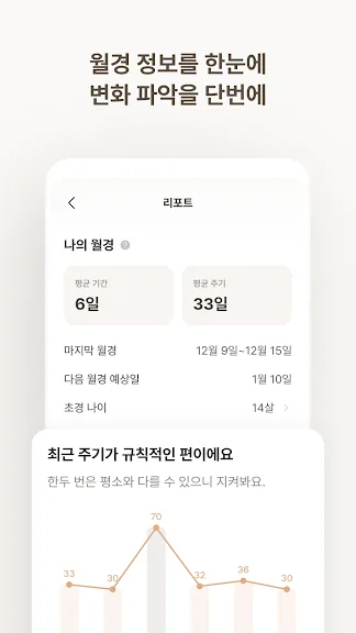 이 생리 주기 및 배란 추적 어플은 불규칙하거나 규칙적인 생리 주기를 모두 쉽게 관리할 수 있도록 도와줍니다. 사용자는 자신의 생리 기간을 기록하고, 다음 생리일, 배란일, 가임기 등을 미리 예측할 수 있습니다. 또한, 월경 증상이나 기분 변화를 기록하고, 생리 및 배란 주기에 대한 알림을 설정하여 중요한 일정을 놓치지 않도록 도와줍니다.