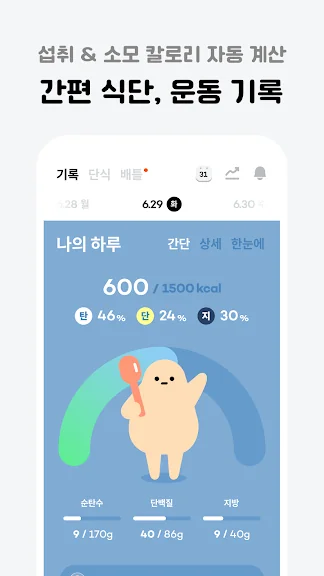 - 오늘 먹은 음식을 식단에 기록해 보세요. 칼로리와 탄단지 섭취량을 자동으로 계산해 드려요