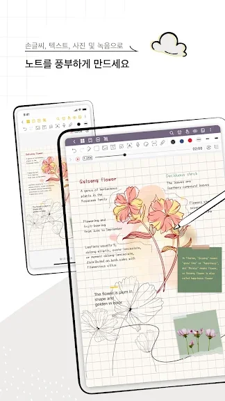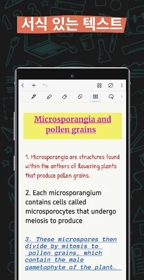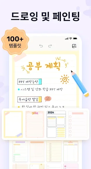 - 다양한 실감 나는 펜과 형광펜을 사용하여 아름다운 손글씨 노트를 작성하세요. 필기체에 미적인 터치를 추가할 수 있는 만년필을 사용해 보세요.