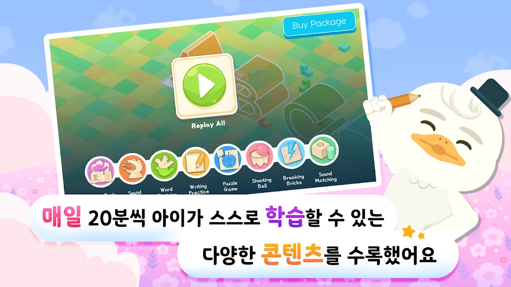 5세부터 10세 유아, 어린이 그리고 초등학생까지 애니메이션과 게임을 통해 스스로 재미있게 영어를 터득하고 파닉스 및 두뇌 능력을 향상시킬 수 있는 플레이러닝앱니다.