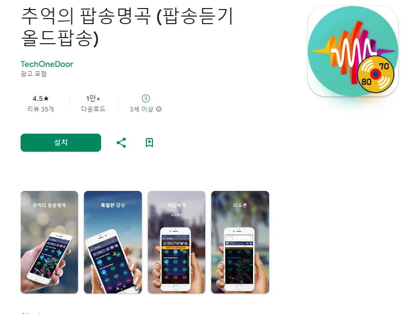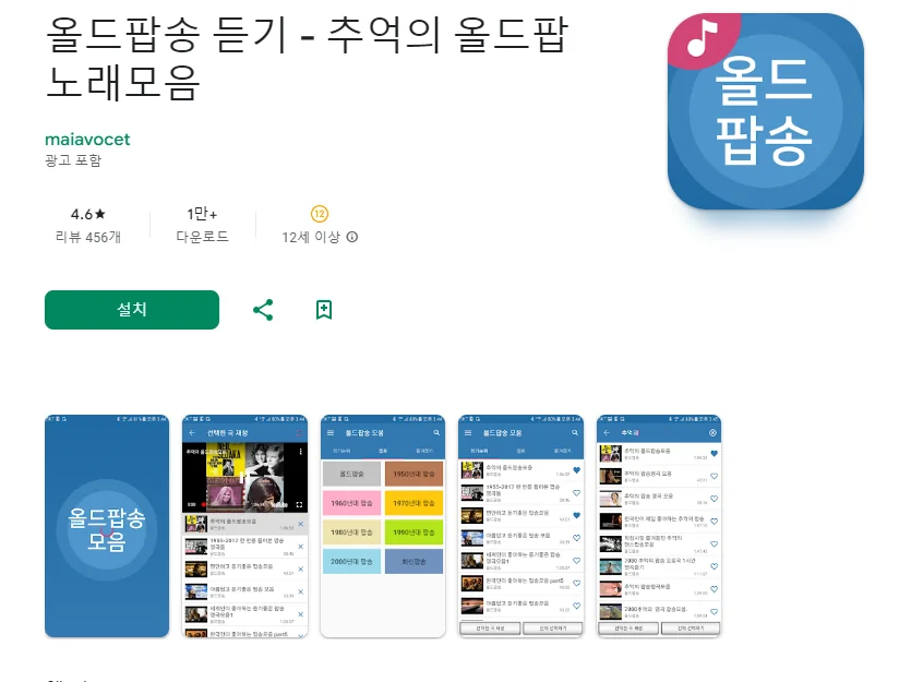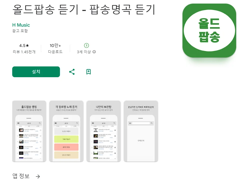 이 어플은 구글플레이스토어에서 "올드팝송 모음"로 검색했을때 4번째로 나오는 어플입니다. 아래는 추억의 팝송명곡 (팝송듣기 올드팝송) 어플에 대한 자세한 설명이니 참고하세요.