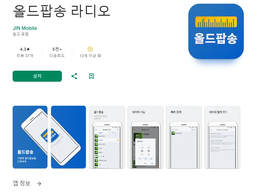이 어플은 구글플레이스토어에서 "올드팝송 모음"로 검색했을때 5번째로 나오는 어플입니다. 아래는 올드팝송 라디오 어플에 대한 자세한 설명이니 참고하세요.