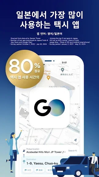 일본에서 택시 앱 사용 시간의 80%를 GO가 점유하고 있습니다.