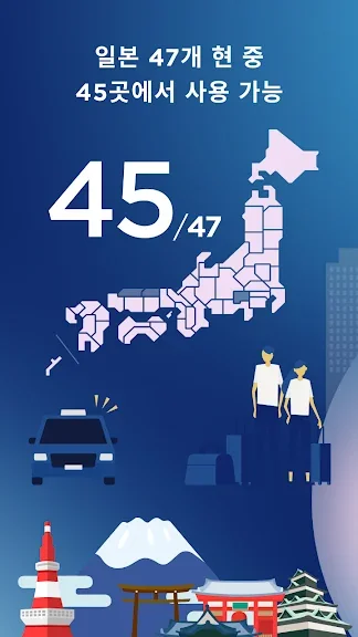 GO는 홋카이도, 도쿄, 교토, 오사카, 후쿠오카, 오키나와 등 주요 관광지를 포함한 일본 47개 현 중 45개에서 운영 중인 1위* 택시 앱(차량 앱)입니다.