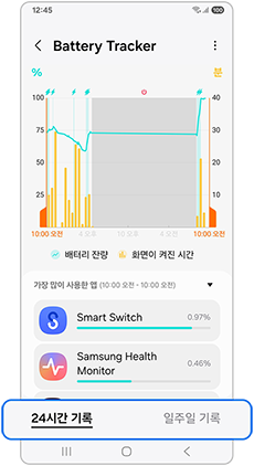 2단계) 24시간 기록/일주일 기록 에서 배터리를 가장 많이 사용한 앱을 확인하세요.