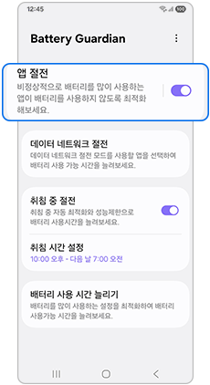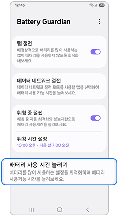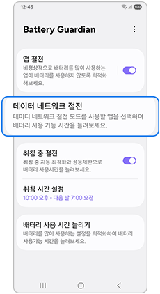 2단계) 앱 절전 / 데이터 네트워크 절전 / 취침 중 절전 / 배터리 사용 시간 늘리기 기능을 설정해 보세요.