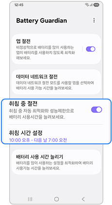 • 취침 중 자동 최적화와 절전 모드를 사용할 앱을 선택하여 배터리 사용 가능 시간을 늘려보세요.