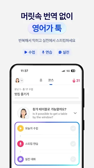 - 회화를 다양한 방법으로 공부하고, 연습해 볼 수 있어요. 하루하루 달라지는 회화 실력을 느껴보세요!