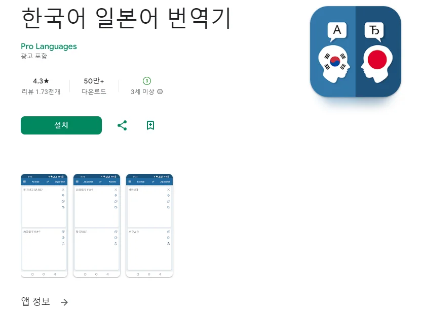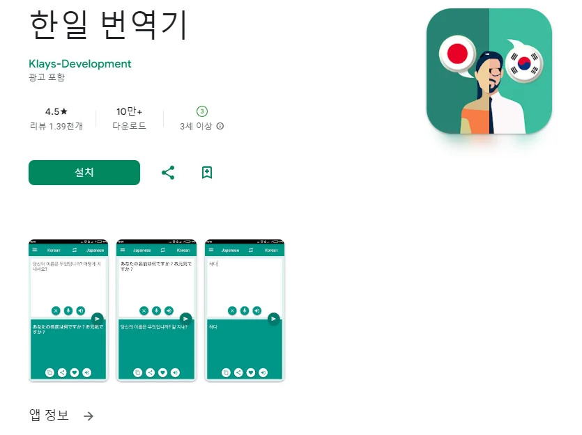 이 어플은 구글플레이스토어에서 "일본어 번역기"로 검색했을때 4번째로 나오는 어플입니다. 아래는 말하는 번역기 - 실시간 초간편 번역, 통역, 회화 어플에 대한 자세한 설명이니 참고하세요.