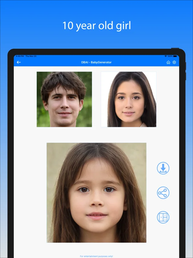 우리의 앱은 인공 지능의 최신 기술을 사용하여 얼굴 특징을 분석하고 미래 아기의 얼굴을 예측합니다.