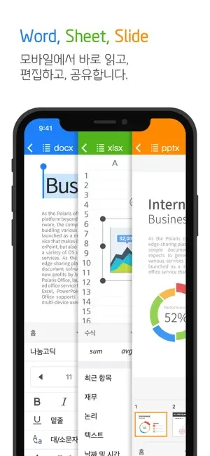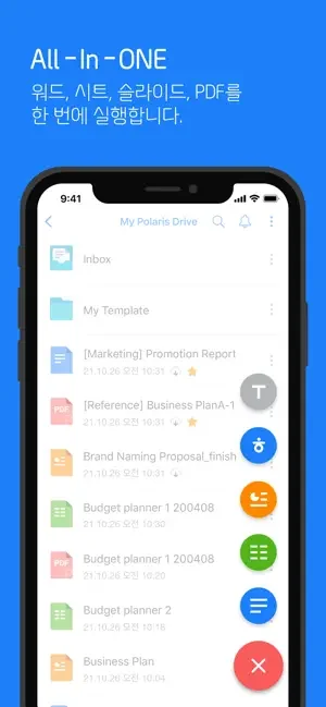 전 세계 1억 명 이상이 선택한 iOS 최고의 오피스 앱! 폴라리스 오피스로 언제 어디서나 쉽고 빠르게 한글, 엑셀, 파워포인트, 워드, PDF 파일을 열고 편집하고 저장해보세요.